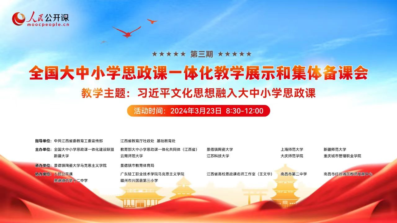 在习近平总书记学校思想政治理论课教师座谈会作出重要讲话5周年之际,3月23日上午,由米乐官网参与主办的全国大中小学思政课教学展示和集体备课会(第三期)在景德镇陶瓷大学举行。会议的主题为习近平文化思想融入大中小学思政课。本次活动由全国大中小学思政课一体化建设联盟单位、教育部大中小学思政课一体化共同体(江西省)、景德镇陶瓷大学、上海师范大学、新疆师范大学、新疆大学、云南师范大学、江苏科技大学、大庆师范学院和重庆城市管理职业学院联合主办,景德镇陶瓷大学mile米乐集团官网和景德镇市教育体育局联合承办,活动全程由人民公开课直播。